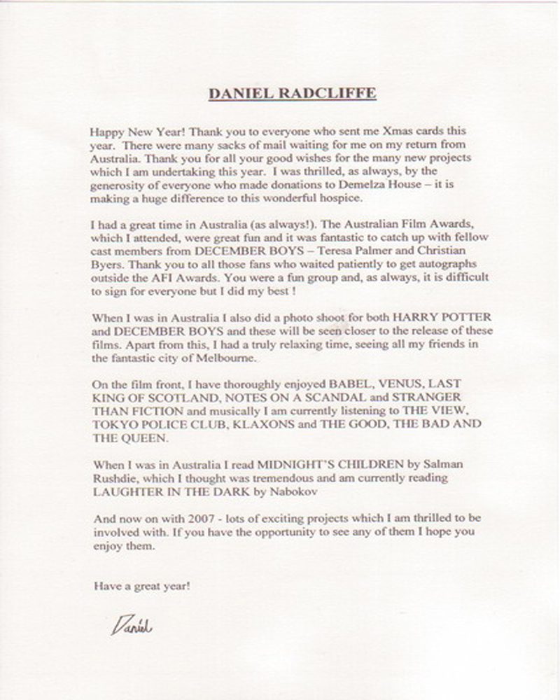 V novém dopise se Dana Radcliffe zmiňuje o pár fotkách z Autrálie na konci minulého roku a jedné z nich je z December Boys a další z Harryho Pottera... Dopis si můžete přečíst tady